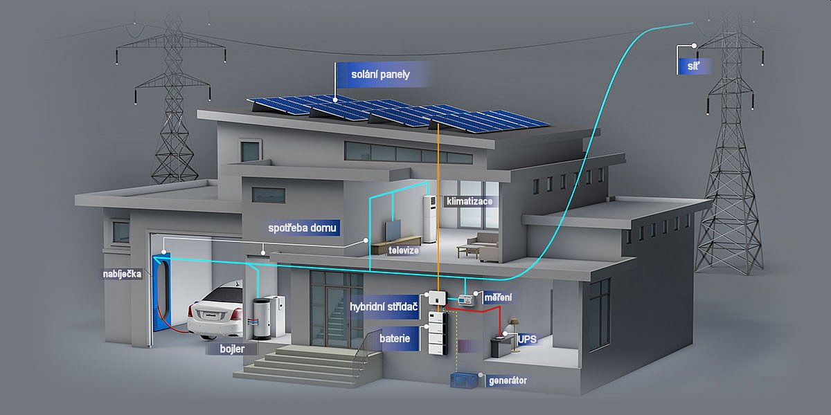 Fotovoltaická elektrárna s hybridním asymetrickým střídačem a bateriemi dokáže veškeré nespotřebované přebytky elektrické energie uchovat v bateriích pro její využití v době, kdy nesvítí slunce (např. v noci). S tímto systémem můžete zajistit zálohu elektrické energie pro vybrané zařízení v domě pro případ výpadku (lednice, mrazák, světla). Současně můžete optimalizovat náklady na ohřev vody tak, aby byla maximálně využita energie ze slunce. Za pomoci komplexního dohledu mobilní aplikací máte vše pod kontrolou. Jsme lídři v úsporném využívání energií a máme vyvinutu vlastní patentovanou technologii (více info na www.energyrouter.eu). S více než 1 500 hodinami slunečního svitu za rok, je Česká republika optimální zemí pro výrobu solární energie. Ve spojení se státní dotací, která může pokrýt více než polovinu ceny FVE, nebyl nikdy lepší čas na pořízení vlastní FVE! Naši odborní pracovníci absolvují pravidelná proškolování nových technologií a postupů a naše administrativní zázemí se denně věnuje našim zákazníkům, aby jejich požadavky byly vyřešeny v co nejkratším možném čase a s maximální spokojeností.