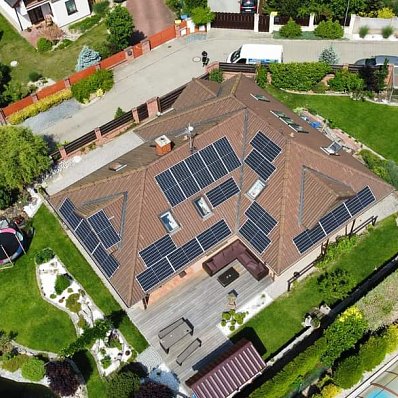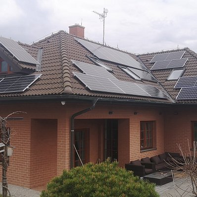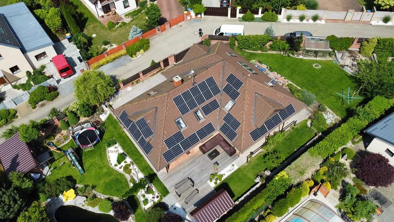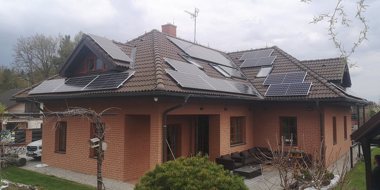 Solární panely o výkonu 9,66 kWp FVE byly postaveny na střechu rodinného domu v Babicích s umístěním střídače a akumulace.