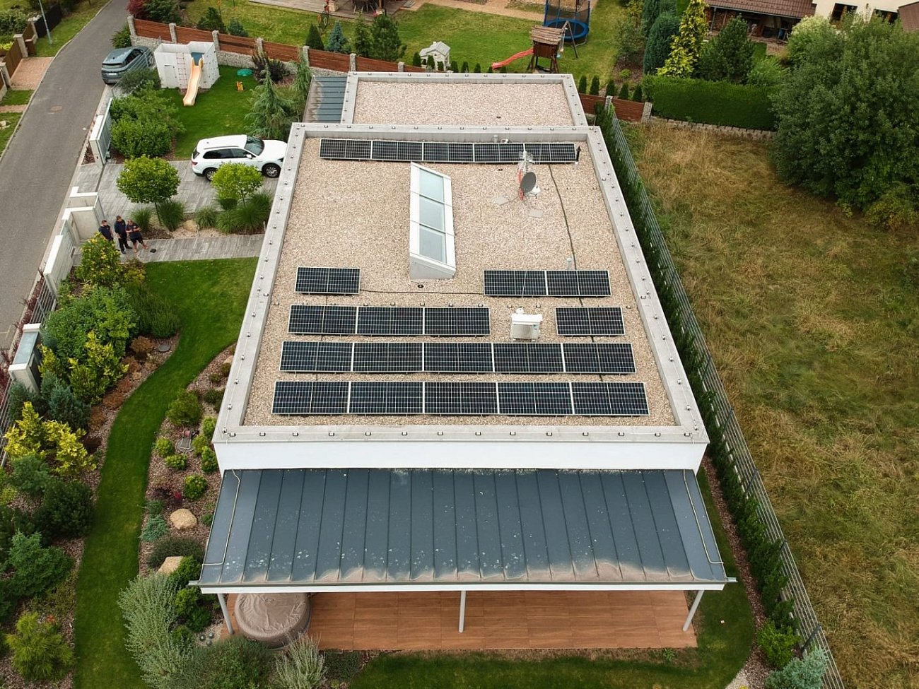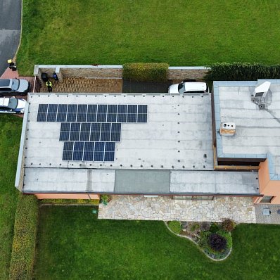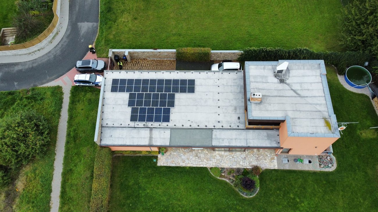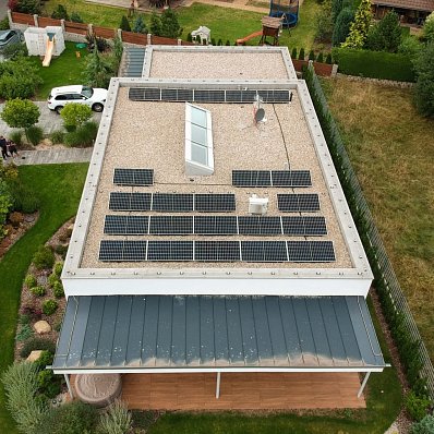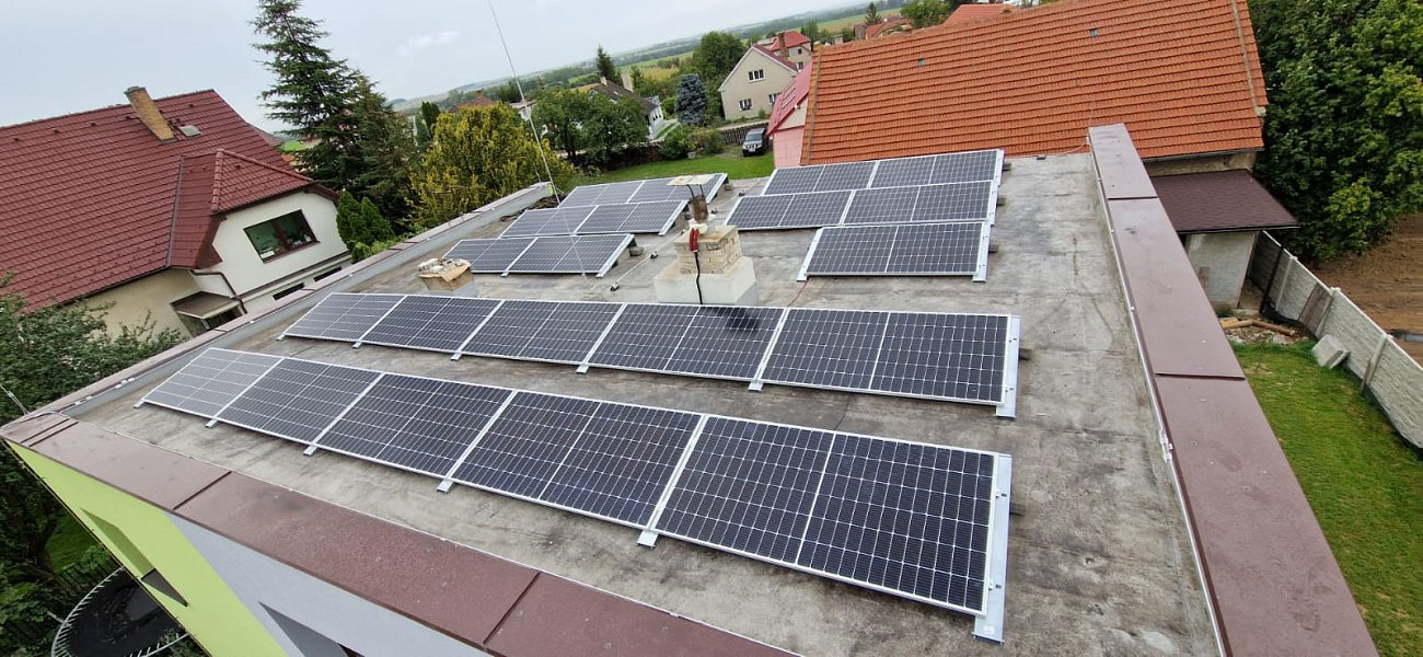 Panely FVE byly umístěny na rovných střechách rodinných domů s použitím speciálních konstrukcí.